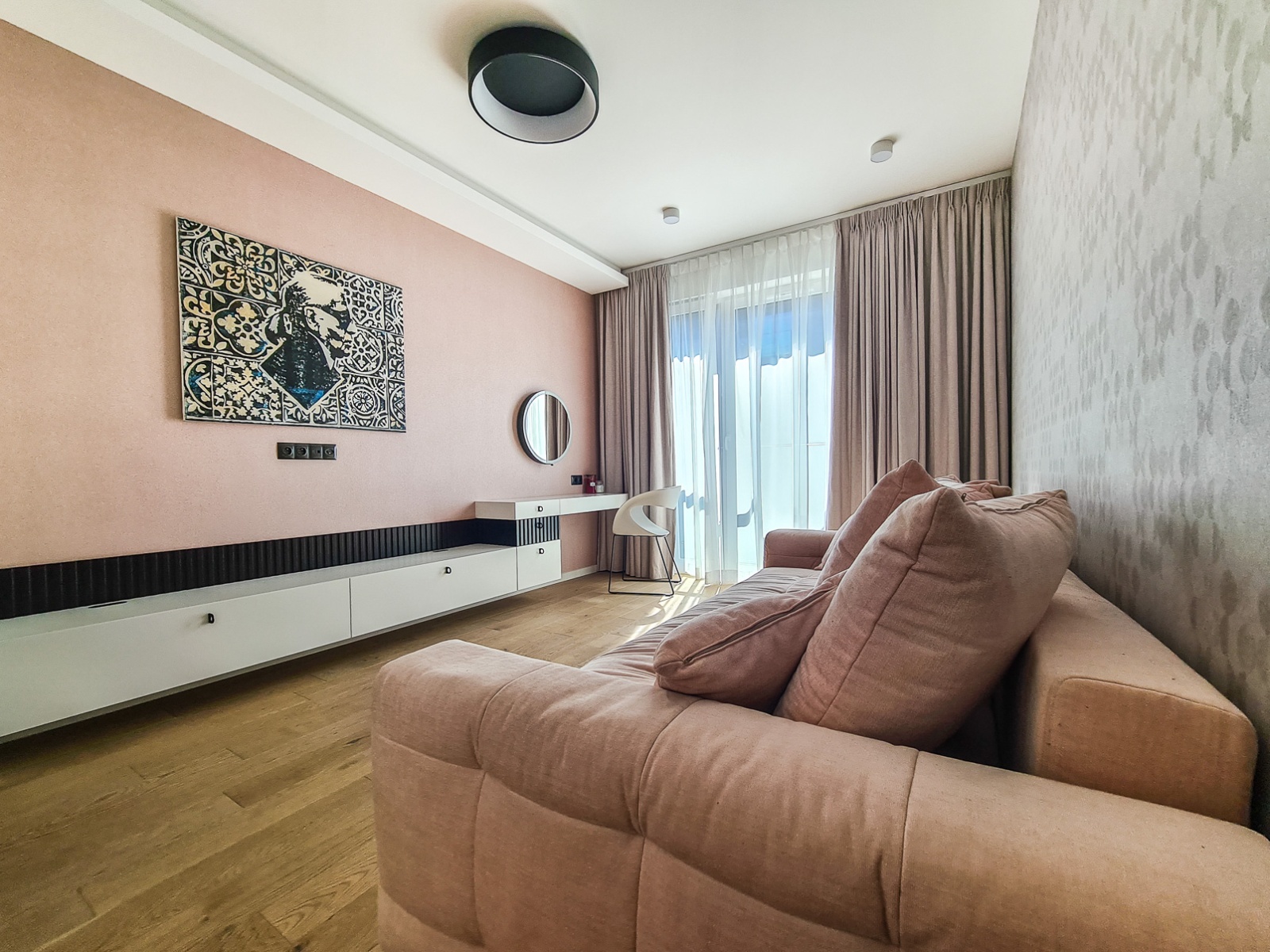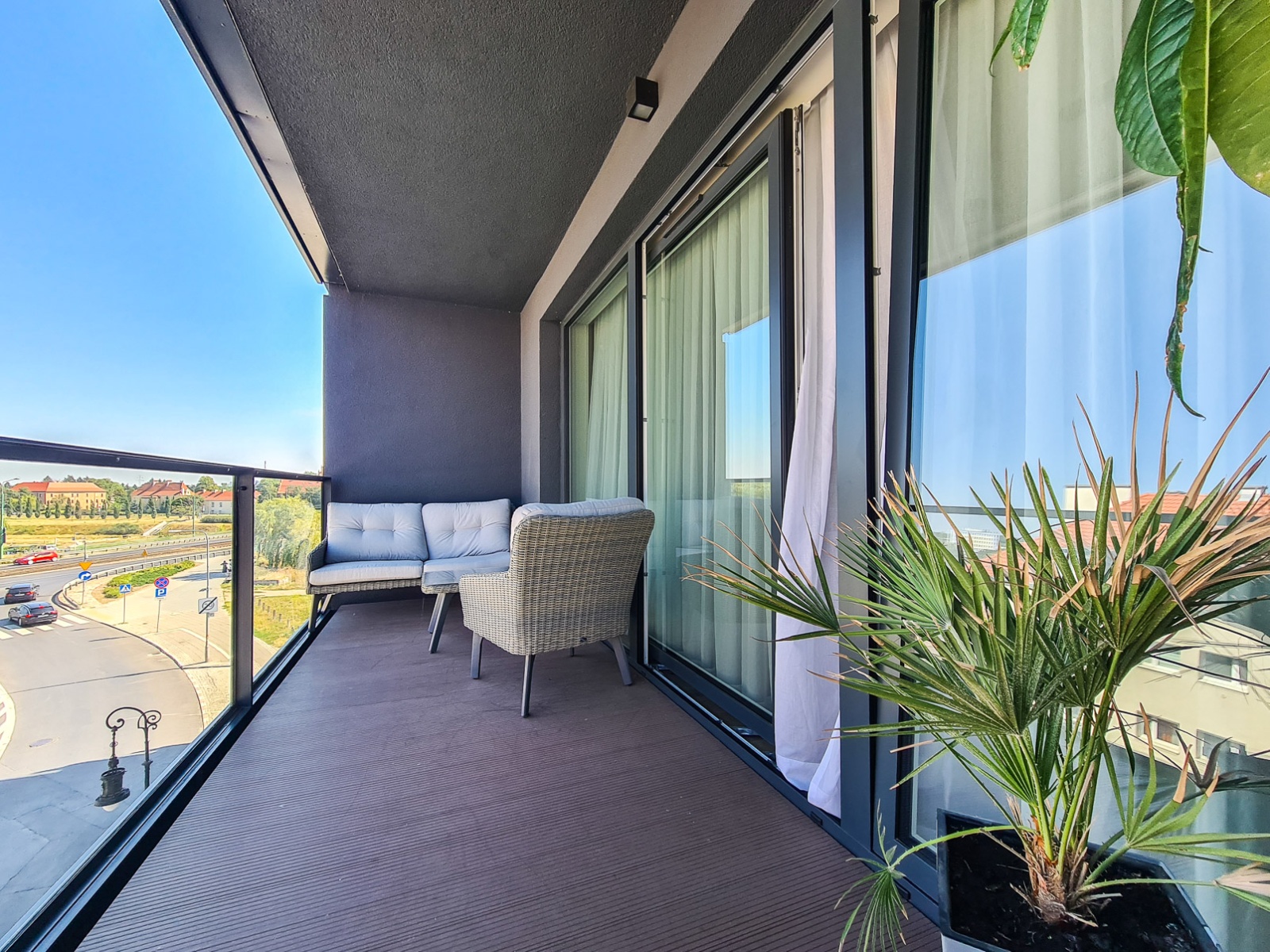 The kitchen is fully equipped with built-in appliances: refrigerator, oven, microwave, dishwasher, induction hob, washer-dryer. The living room features a large corner sofa, air conditioning, and access to a terrace with an impressive view.