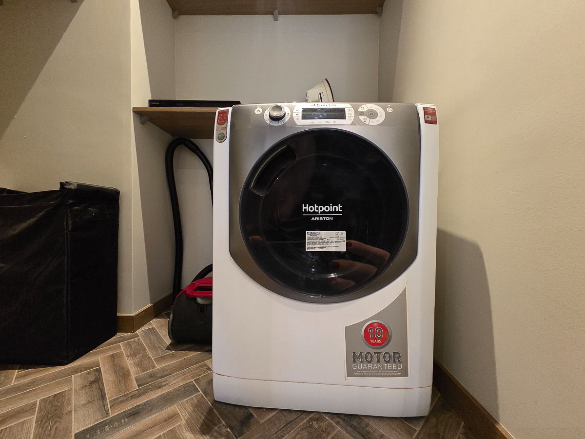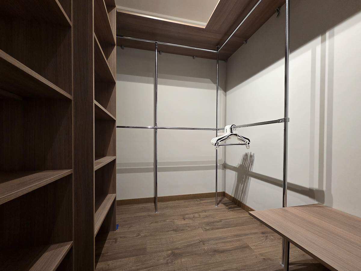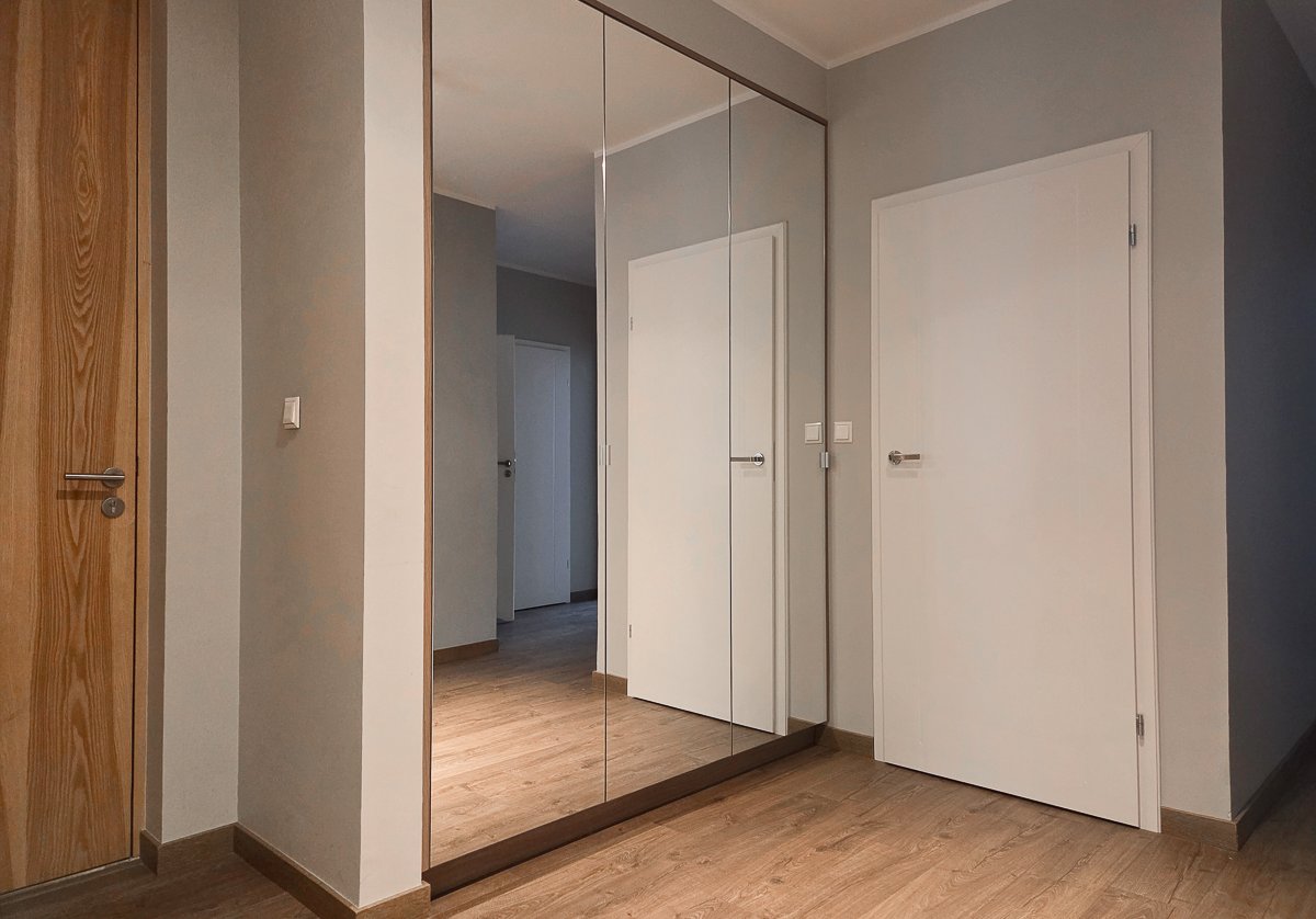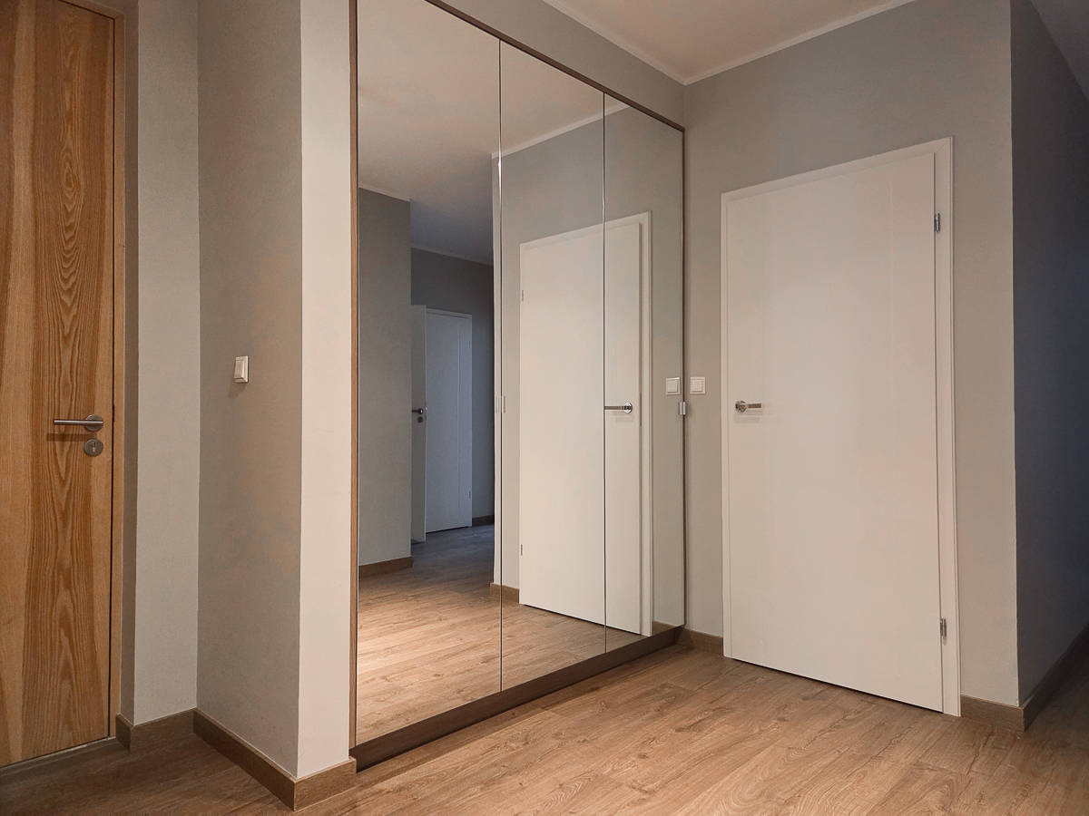 Funkcjonalność: Osobna garderoba, pralnia/pomieszczenie gospodarcze oraz korytarz z lustrzaną szafą.