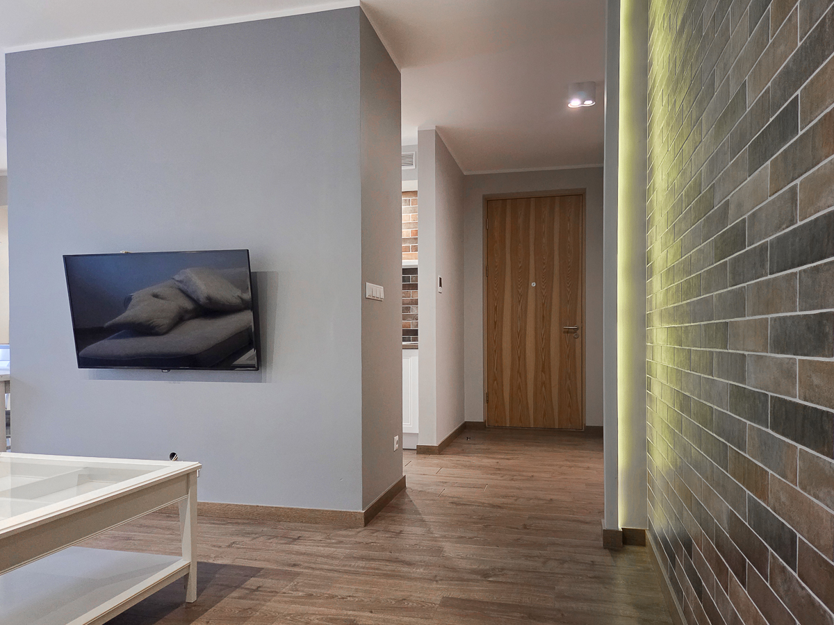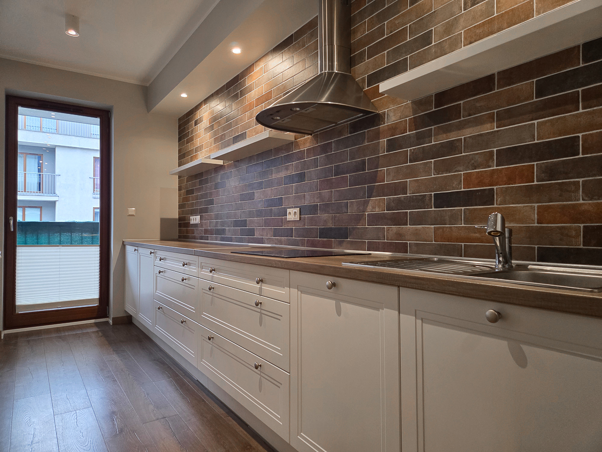 Strefa dzienna: Salon z aneksem kuchennym (stylowa biała zabudowa i ceglane wykończenia).
